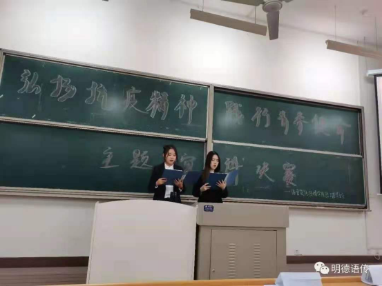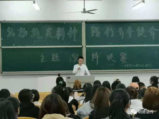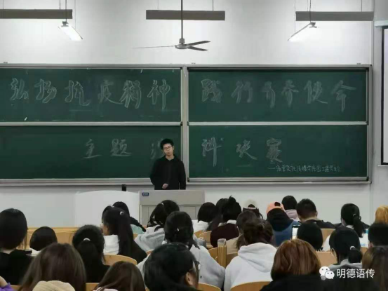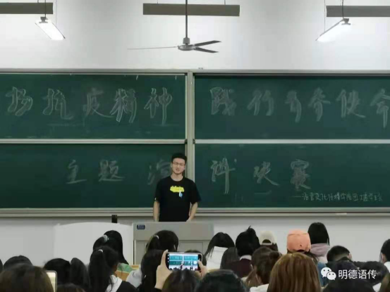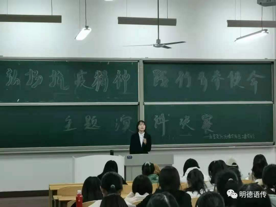 武天麒同学沉稳的表现和引人入胜的演讲,让我们真实的感受到了抗疫工作者的无私奉献。他也用古人抗击敌人英勇的精神来体现我们当今的医务工作者在面对疫情时的无所畏惧。