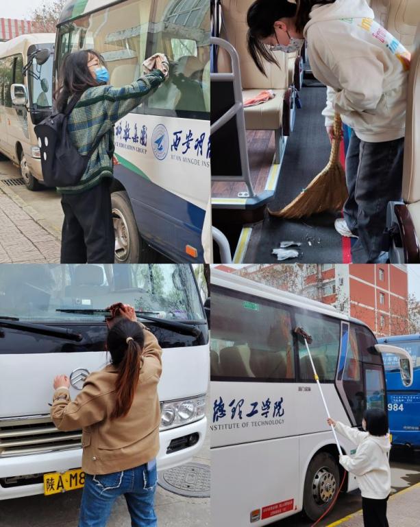 本次活动主要内容是打扫清洗校车。此次活动共分6个小组,均由党员与团员构成,每组负责一辆校车的卫生打扫任务。志愿者分工明确,团结协作。每个小组均对校车内部垃圾进行了清扫,并对校车的外部玻璃,车牌,车身进行了擦拭与冲洗。从车厢内的每一排座椅、每一扇车窗玻璃、每一根扶手,到车外的车身、轮胎、挡风玻璃,同学们都悉心清理,用心擦拭。经过同学们的共同努力,校车焕然一新,尽管当天天气仍有些清冷,但劳动后的大家心里确实是暖洋洋的,大家都期盼着老师们坐上干净、清新的校车后的愉悦心情。