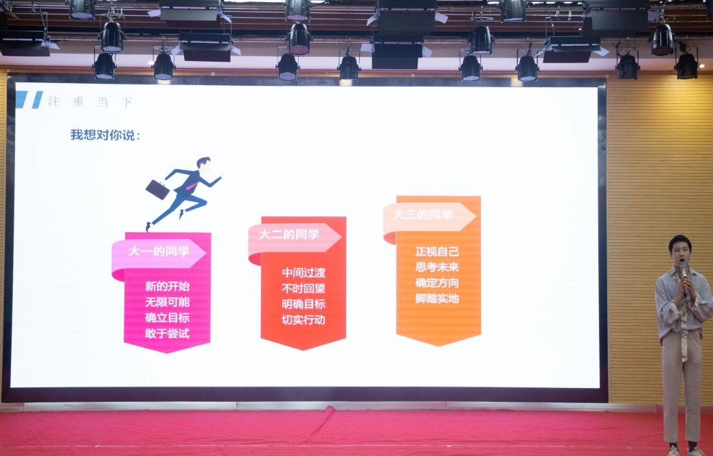 刘佳程同学从思想、工作、学习、未来四个方面向我们分享了自己的大学生活,介绍了自己的社会活动以及取得的各项成就。他告诉同学们要珍惜大学生活的每一分每一秒,不断充实自己。最后,他希望同学们可以在各种活动中培养自身优秀品质,学会在挫折中成长。