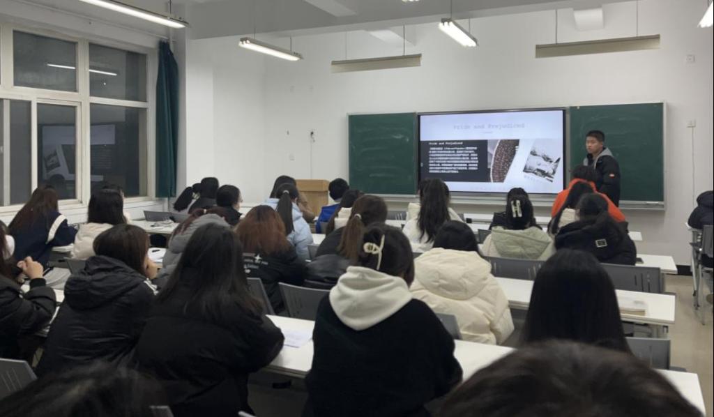 瞿苗苗和谢宇轩两位同学分别分享了英国作家简·奥斯汀(Jane Austen)的作品《傲慢与偏见》。书中两位主人公从最初的“偏见让别人无法接受我,傲慢让我无法爱上别人”到最后打破所有的偏见,放下所有的傲慢,坚定走向对方,他们被对方身上一切美好事物所吸引,这无关金钱与名利,有的只是真诚、勇敢、坦诚和不遗余力的爱。