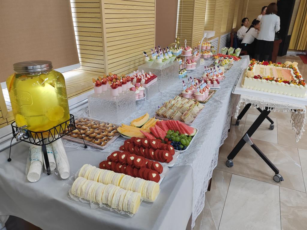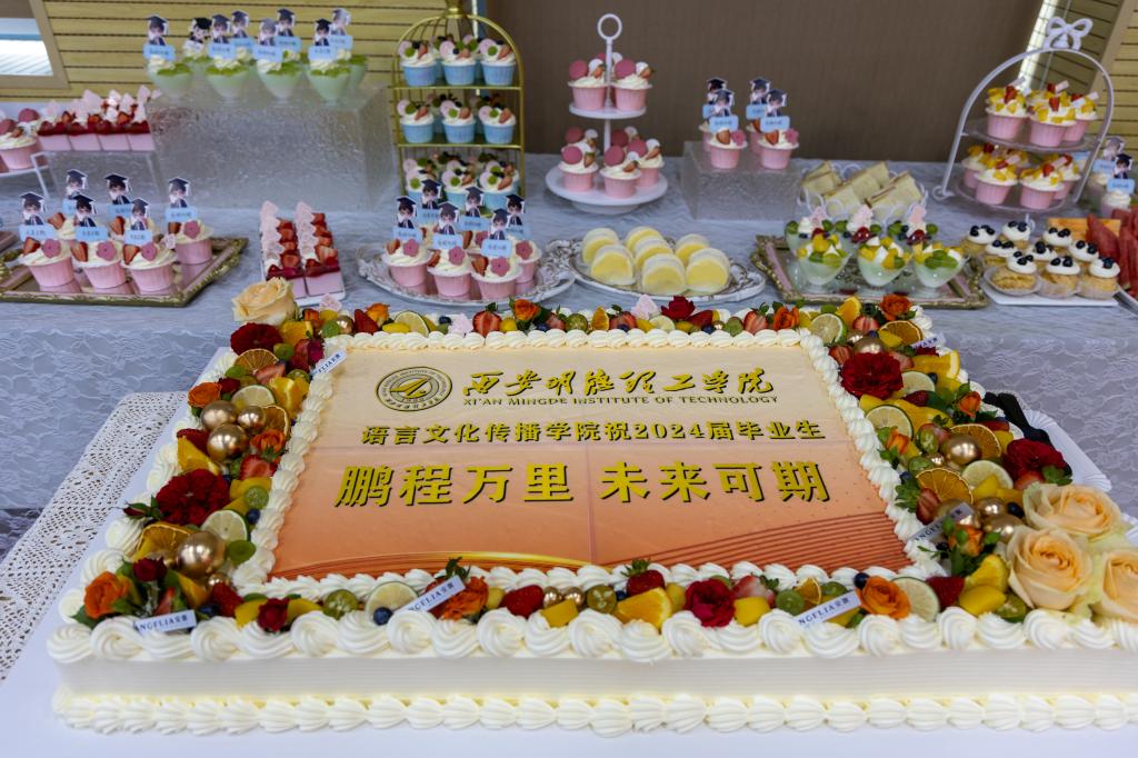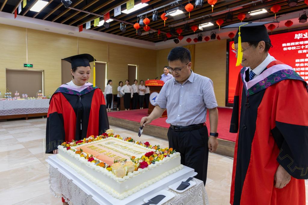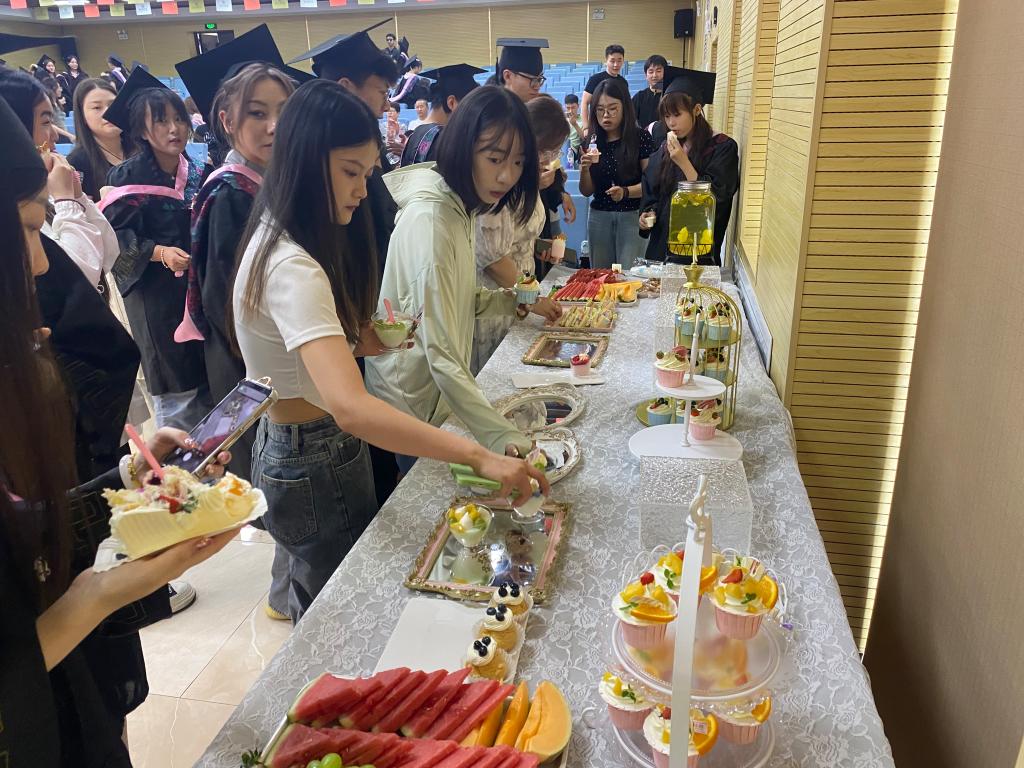 学院为同学们准备了甜点和水果,王斌宁为同学们分切蛋糕,与学院毕业生及家长共同分享毕业时刻的甜蜜与喜悦。随后,全体学生庄严宣誓,学位授予仪式正式开始。在庄重而热烈的氛围中,学位委员会的导师们为毕业生一一拨正流苏、颁授学位证书。这一刻,毕业生们的脸上洋溢着激动和自豪的笑容,他们纷纷与导师们合影留念,记录下这一难忘的时刻。