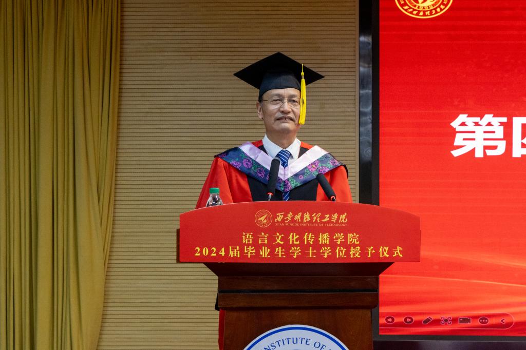 在师生的热烈掌声中,院长马庆林代表学院致辞,向全体毕业生表达了最热烈的祝贺和最真挚的祝福。他表示,寒来暑往、春华秋实,同学们在学院用热爱点燃梦想、用奋斗谱写青春华章,拨节孕穗、蜕变成长。他希望语传学子面对未来要胸怀壮志,以远大的理想引领人生航向;要脚踏实地,以扎实的学识牢筑事业基础;要勇于创新,以开放的心态拥抱风云变化;要锐意进取,以不懈的努力追求卓尔不凡。