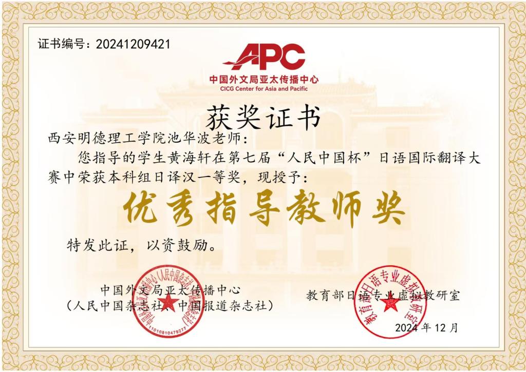 语言文化传播学院日语专业2021级黄海轩同学获得“本科组日译汉一等奖”,2021级朱雯雯同学获得“本科组日译汉三等奖”。日语专业教师池华波获得“优秀指导教师奖”。