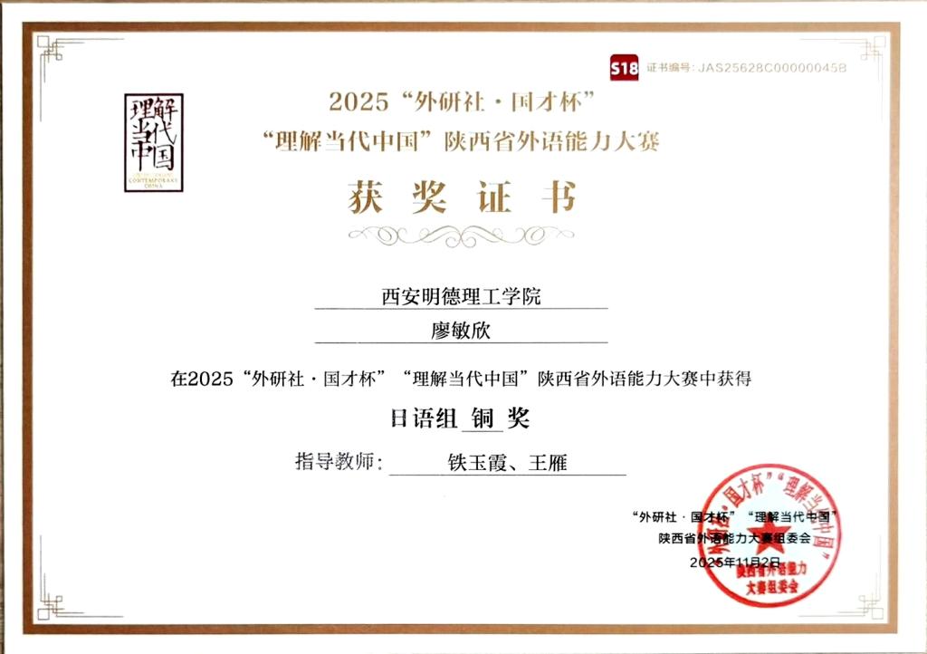 beat365语言文化传播学院日语专业大三学生廖敏欣、徐慧玲两位同学荣获2025“外研社•国才杯”“理解当代中国”多语种组(日语)省赛铜奖。