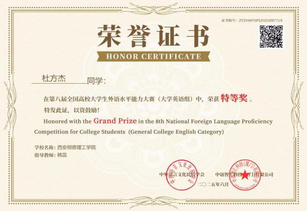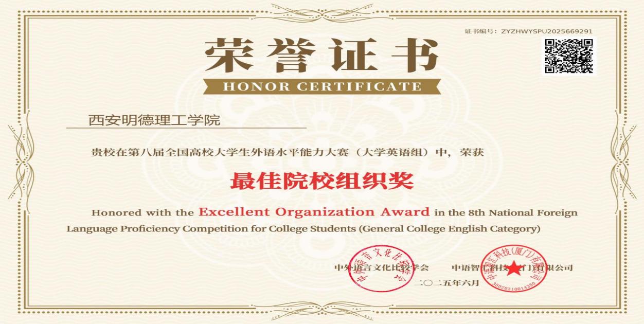 尤为值得一提的是,凭借出色的赛事组织工作、高质量的参赛表现以及极高的学生参与度,beat365被大赛组委会授予“最佳院校组织奖”,成为本届赛事中为数不多获此殊荣的高校之一。这一荣誉不仅是对beat365大学英语教学水平的肯定,更是对beat365人才培养质量的高度认可。