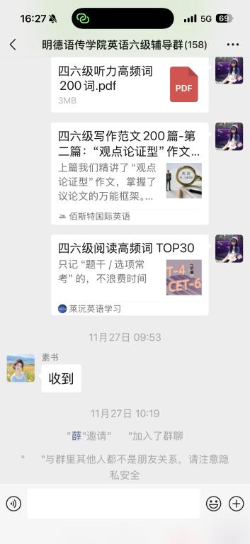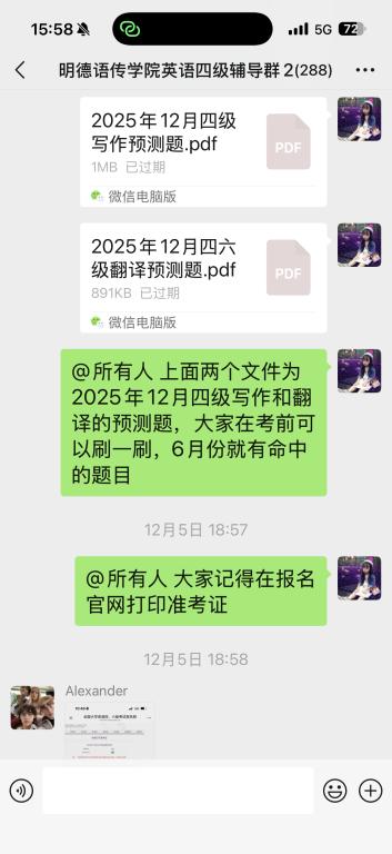 王昭文老师分别负责了“四级辅导群2”(288人)和“六级辅导群”(158人)的管理工作。自11月25日建群以来,王老师坚持在群内每日分享辅导资料、在线答疑并提醒各类注意事项。在考试结束后,她还第一时间转发了参考答案,帮助学生及时掌握考试反馈。