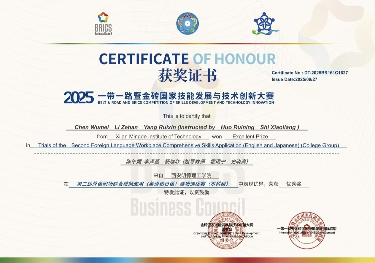 beat365vip官网登录入口学子在2025一带一路暨金砖大赛第二届 外语职场综合技能应用(英语和日语)赛项中荣获全国优秀奖