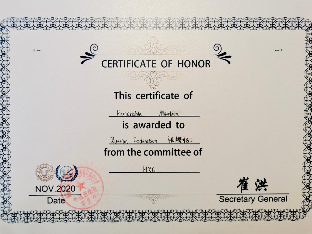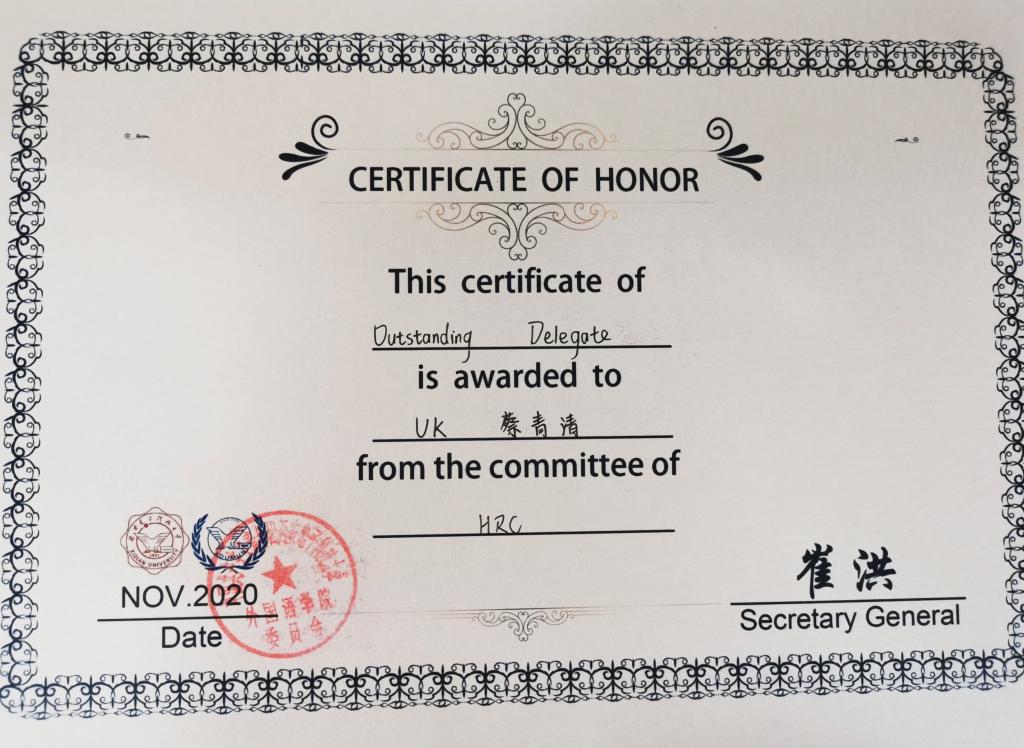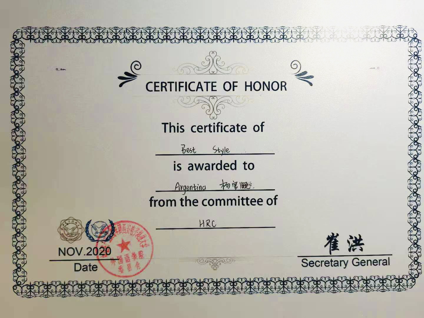 2020年11月13日至11月15日,beat365模拟联合国团队共派出七名代表参西安电子科技大学第十一届模拟联合国大会,斩获个人奖三项,分别是最佳风格奖(Best Style)——杨官凝,杰出代表奖(Outstanding Delegate)——蔡青清,以及荣誉提名奖(Honorable Mention)——张樱怡。
