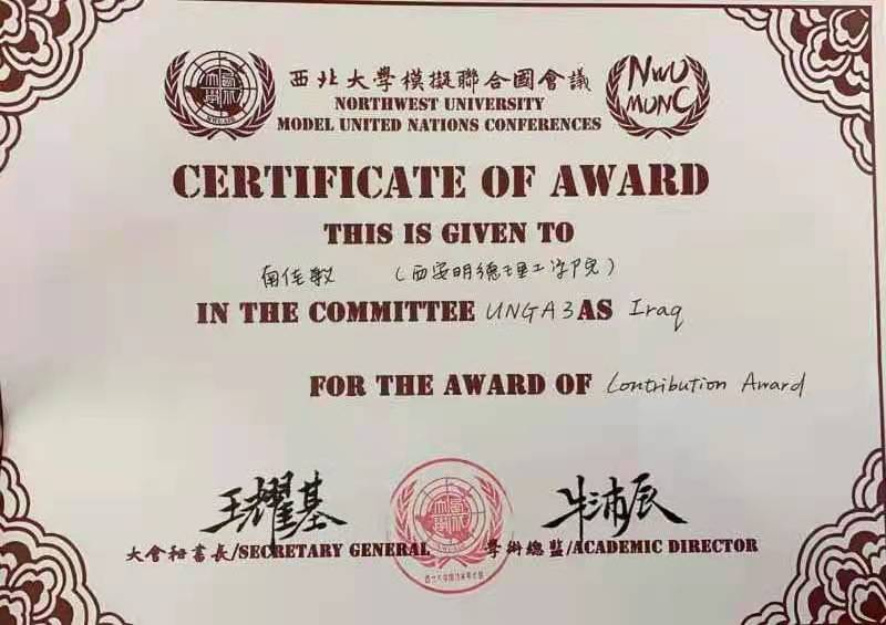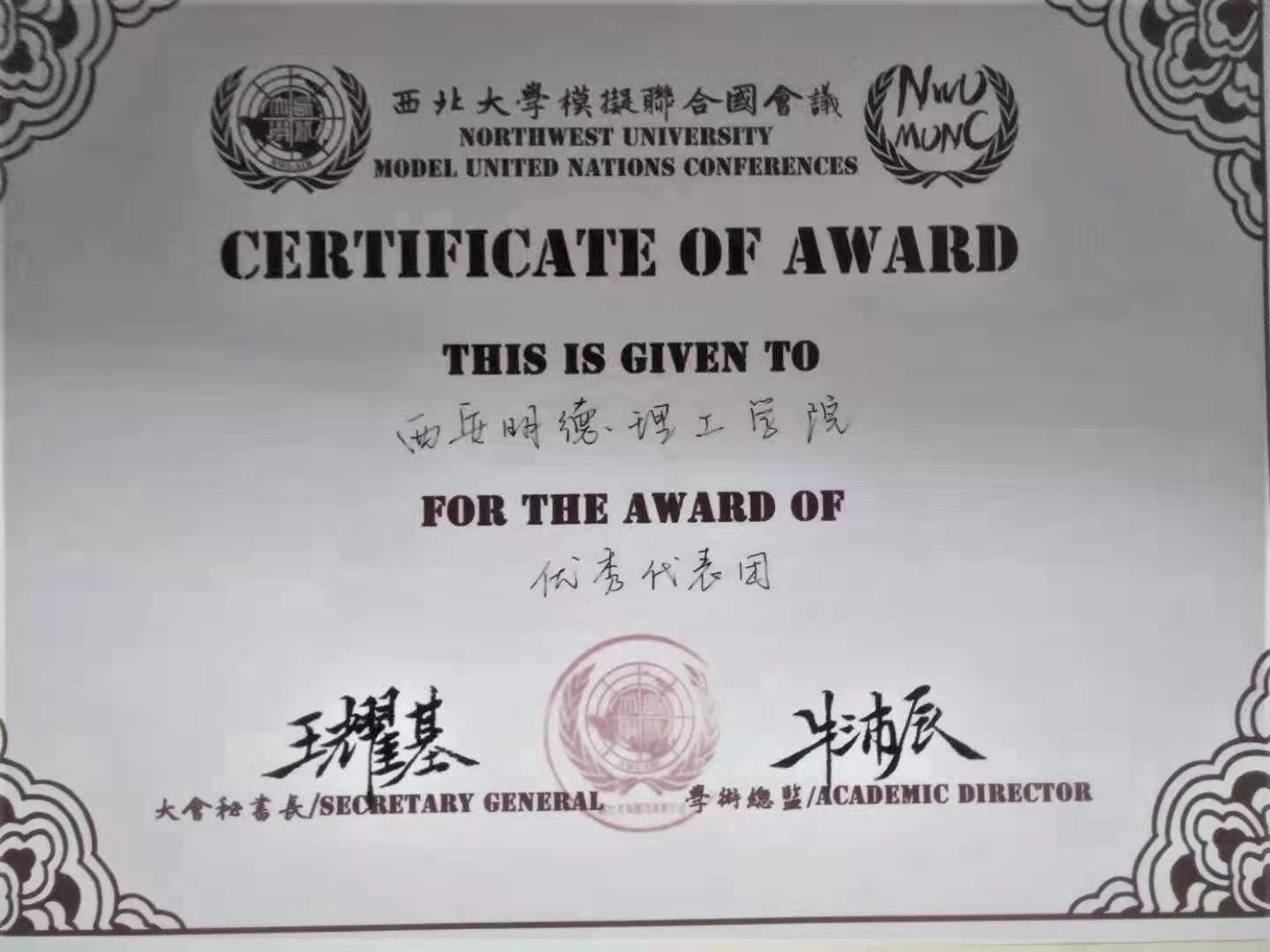 2020年12月4日至6日,beat365模拟联合国团队共派6名代表和3名观察员参加西北大学第八届冬季模拟联合国大会,表现出色,荣获优秀代表团奖一项,个人最佳贡献奖(Contribution Award)一项。