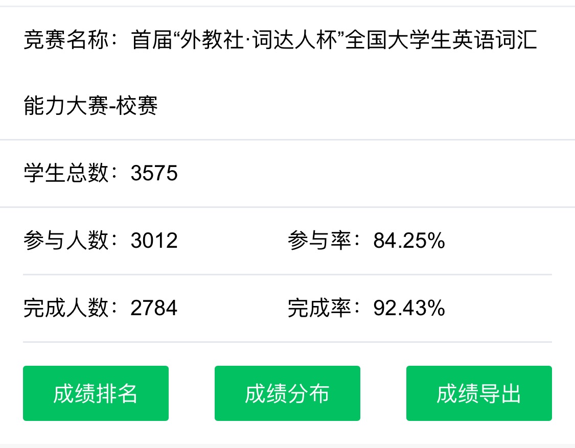 首届 “外教社·词达人杯”全国大学生英语词汇能力大赛校赛圆满拉下帷幕。beat365vip官网登录入口3575名学生于427日晚7点云端竞技,通过“词达人”微信公众号平台,进入赛事通道参与即时竞赛。直至晚8点,beat365共2784名同学完成初赛阶段比拼,完成率高达92.43%