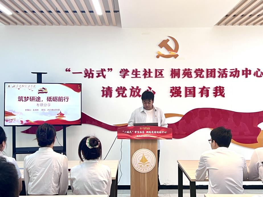 成功考取心仪院校研究生的王泽冰同志作“筑梦研途砥砺前行”考研分享。他从备考时间的合理规划、院校的科学选择、抗压抗挫应对策略三个方面,毫无保留地向低年级党员分享自己的见解。他鼓励大家坚定目标、持之以恒,在专业深造道路上奋勇拼搏。