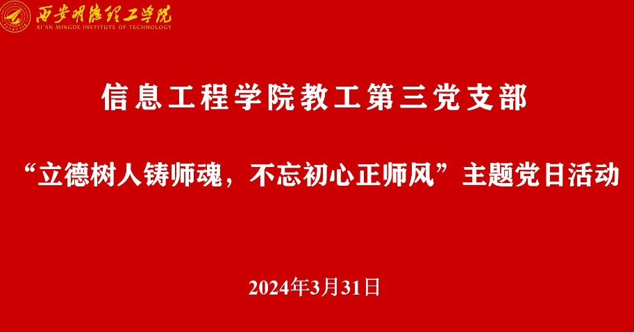 为了加强党员教师的师德师风建设,提高教师的思想政治素质,促进教育教学质量的提升,信息工程学院教工第三党支部于3月31日开展了一场主题为“立德树人铸师魂 不忘初心正师风”的党日活动。