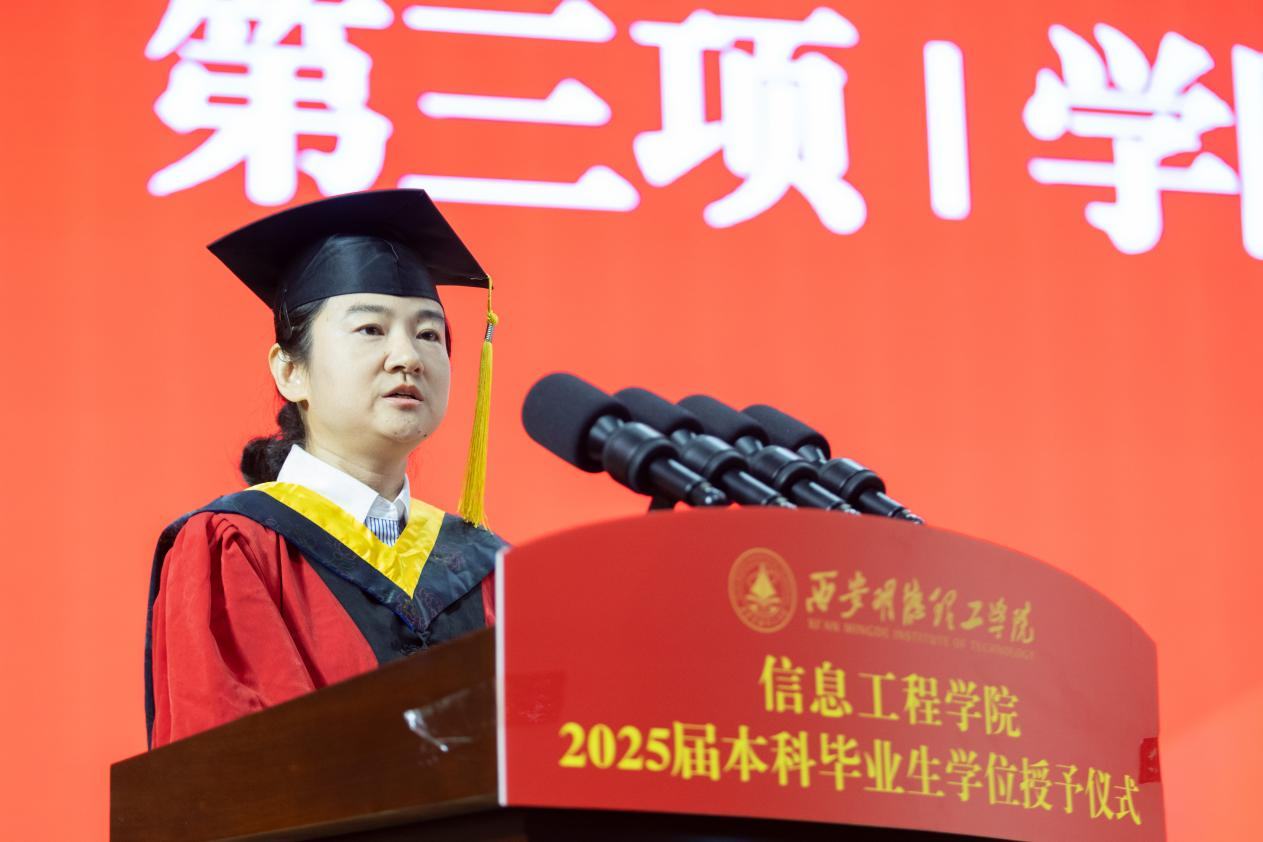 教师代表马蕾教授向学院圆满完成学业的毕业生送上美好的祝福。他希望同学们永远保持对技术的热爱与探索的热情,用所学知识为社会创造价值;在面对挑战时,能够沉着冷静,用智慧与勇气攻坚克难。在信息技术这个快速发展的领域保持竞争力,同时时刻拥有一颗感恩的心,承担起历史赋予的责任和使命,成为国家栋梁之才,做永远向上的中国青年!