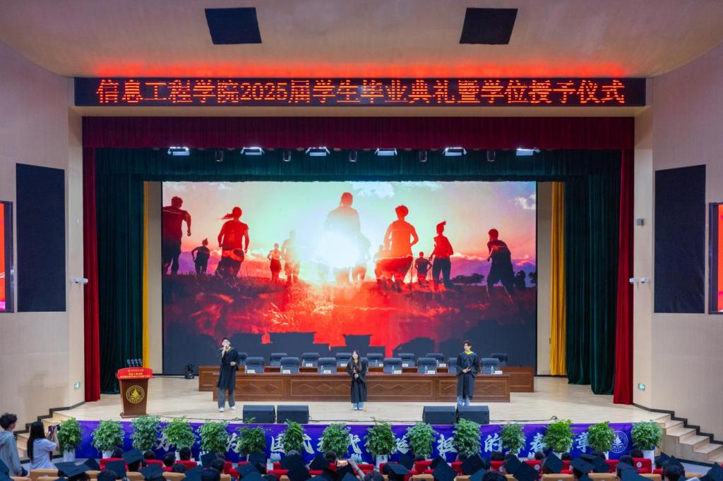 盛夏蝉鸣起,骊歌再奏响。6月24日上午,信息工程学院在四季廊桥报告厅举行2025届学生毕业典礼暨学位授予仪式。出席典礼的有学校校长王志刚,学院党委书记肖千春,学院副院长范晖、张伟岗,学校学位评定委员会委员、北斗应用技术学院副院长张健,学校学位评定委员会委员陈世亮,学院党委副书记高长江,学院办公室主任尹莹,各专业负责人、家长代表、毕业班辅导员、全体2025届毕业生。典礼由学院党委书记肖千春主持。
