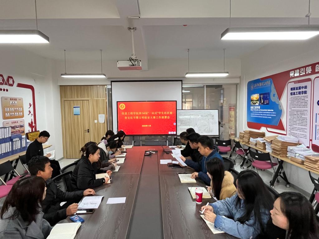 11月13日,信息工程学院召开第14届“一站式”学生社区宿舍文化节暨文明寝室大赛工作部署会。本次会议以营造向上向善、文明和谐的宿舍文化氛围和勤学善思、知行合一的优良学风,引导学生养成良好生活习惯、锤炼团队协作精神,筑牢“学在明德”学风建设根基为核心目标,学院全体辅导员参会。