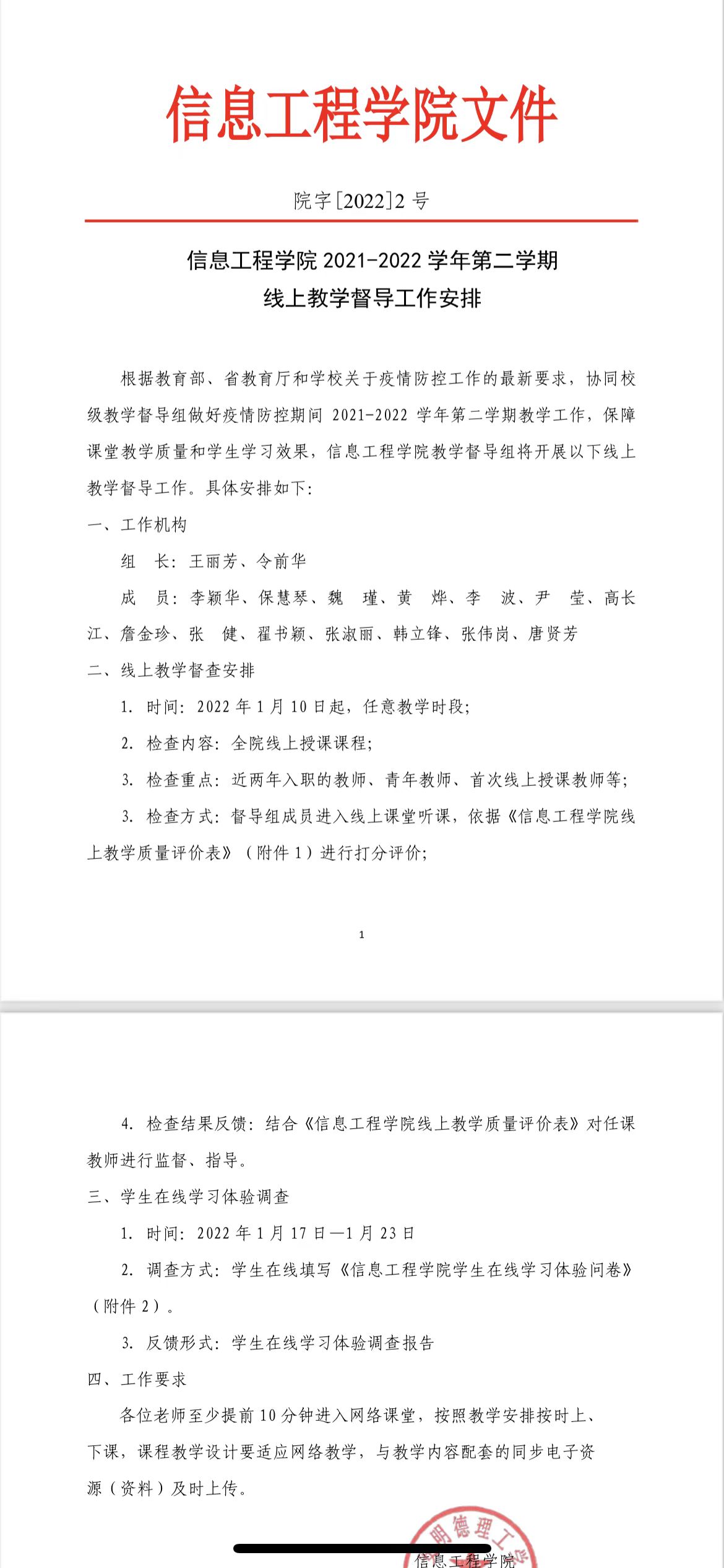 我院高度重视疫情防控下的教育教学工作,成立以院长王丽芳为组长的信息工程学院教学工作专班,多次组织召开线上会议,研究讨论疫情期间线上教育教学工作。同时,成立由令前华任组长的线上教学督导组,开展线上教育教学实施情况专项督查,深入线上课堂开展教学巡查,发现问题及时督促改进。