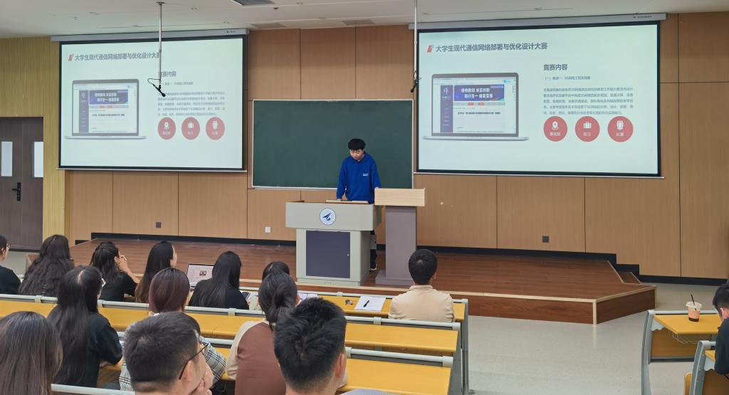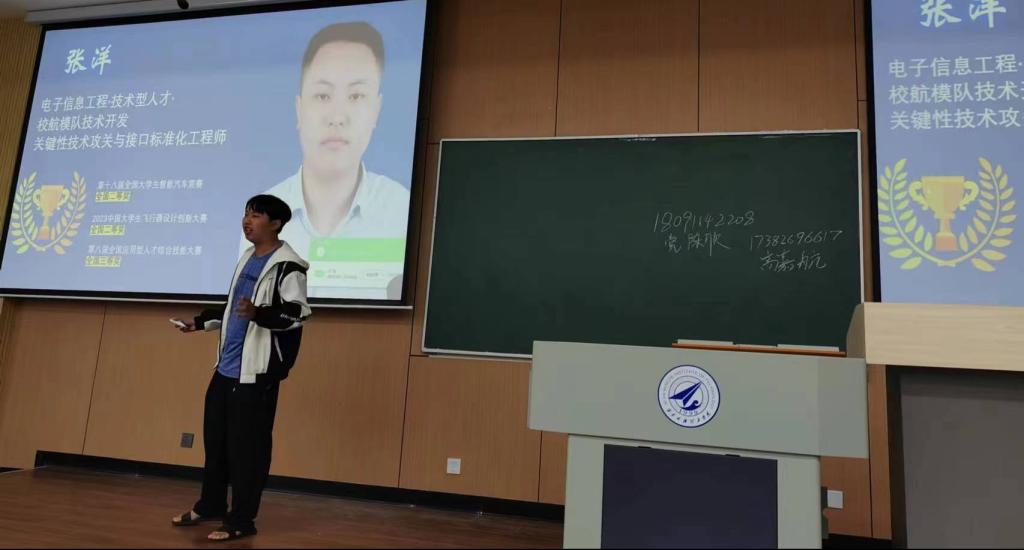 随后,各年级的学生代表上台,分享了他们参加各类学科竞赛的经验和收获。大三学生代表高嘉航分享了自己在IUV、大唐杯大赛中获奖的经历,强调了团队合作的重要性以及创新思维在竞赛中的运用。大三学生代表党陈欣,大二学生代表张洋、杨智勇分别介绍了自己目前的备赛情况及在研项目,并对全体同学发出邀约,欢迎志同道合的同学们一起参与。