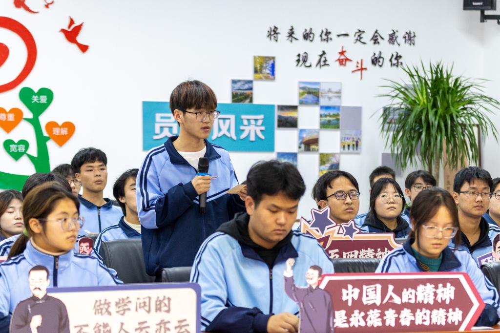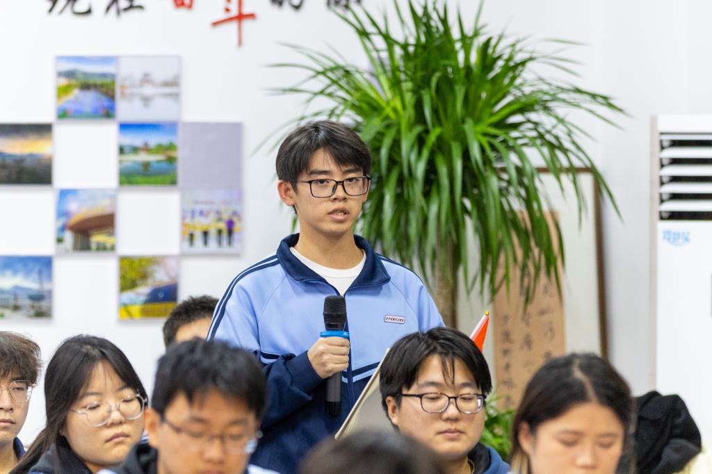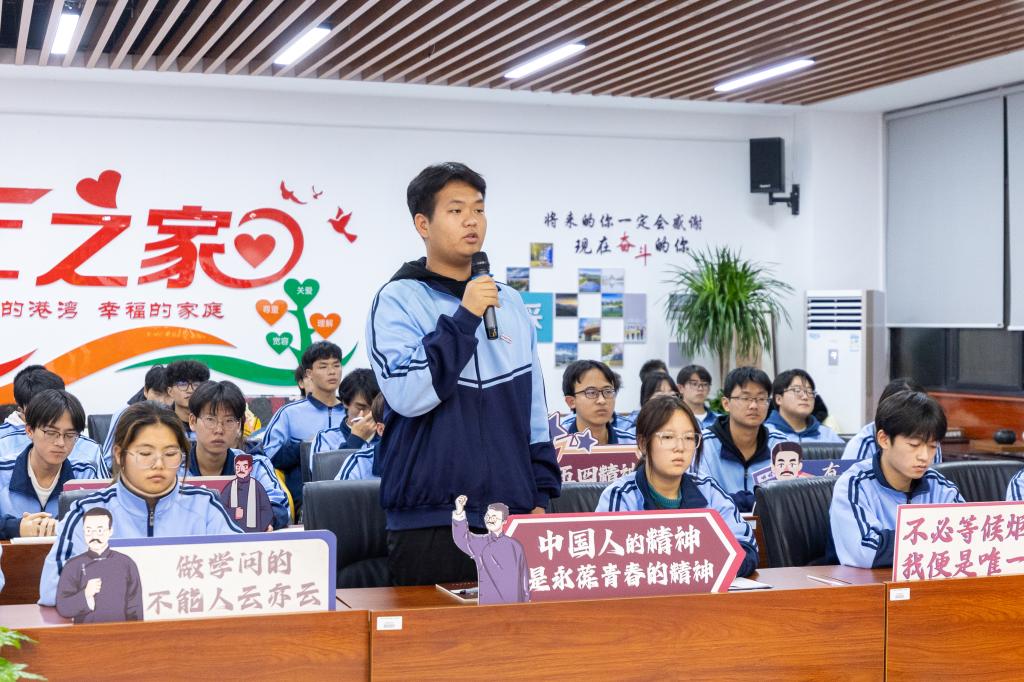 近1小时的“翻转课堂”环节中,42名学生和班级辅导员兰艳老师在观看电视剧《觉醒年代》后踊跃发言,热烈交流。他们从爱国爱校的炽热情怀出发,回溯五四运动历史,感悟马克思主义中国化的艰辛探索,筑牢理想信念根基;立足个人学业规划,着眼国家建设需求;展望青年使命担当,矢志传承文化精髓。同学们以剧中人物与历史情节为生动蓝本,各抒己见、畅所欲言,情真意切地表达当代青年应将个人理想与家国使命相融相契。学院党委书记肖千春适时引导,对每一位同学的发言悉心点评,深入启迪,激发思维碰撞,现场思维火花四溅,爱国之情与报国之志激荡交融。