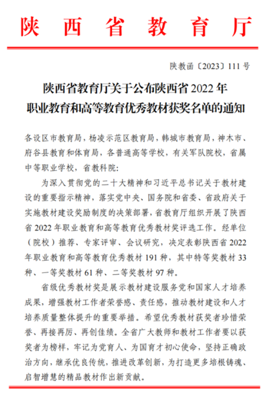 根据《陕西省教育厅关于开展2022年职业教育和高等教育优秀教材奖评选工作的通知》,我院张健副院长主编的《计算机网络实训教程》获陕西省优秀本科教材二等奖。