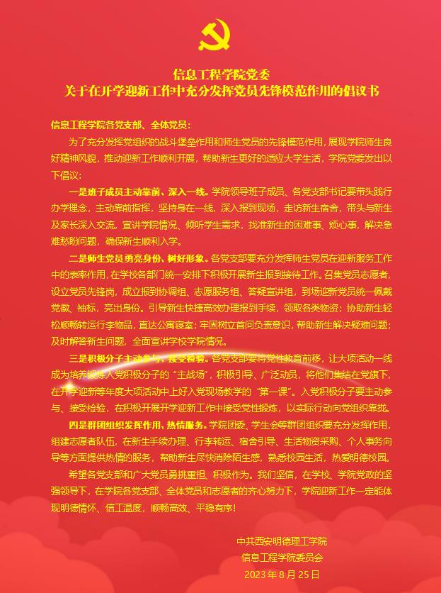 信息工程学院党委关于在开学迎新工作中充分发挥党员先锋模范作用的倡议书