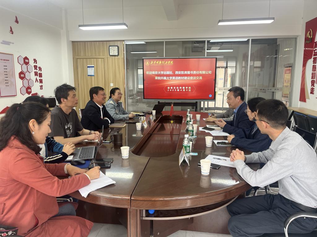 刘勇副院长感谢南京大学出版社英语编辑裴维维对大学英语系列教材书稿提出的修改意见。杨书涛总经理认为AI不能取代人的创造性和专业性,欢迎学院学子去西安凯育图书出版有限公司实习。史晓亮主任、杨茹、潘萌等教师与对方交流了书籍编写细节。