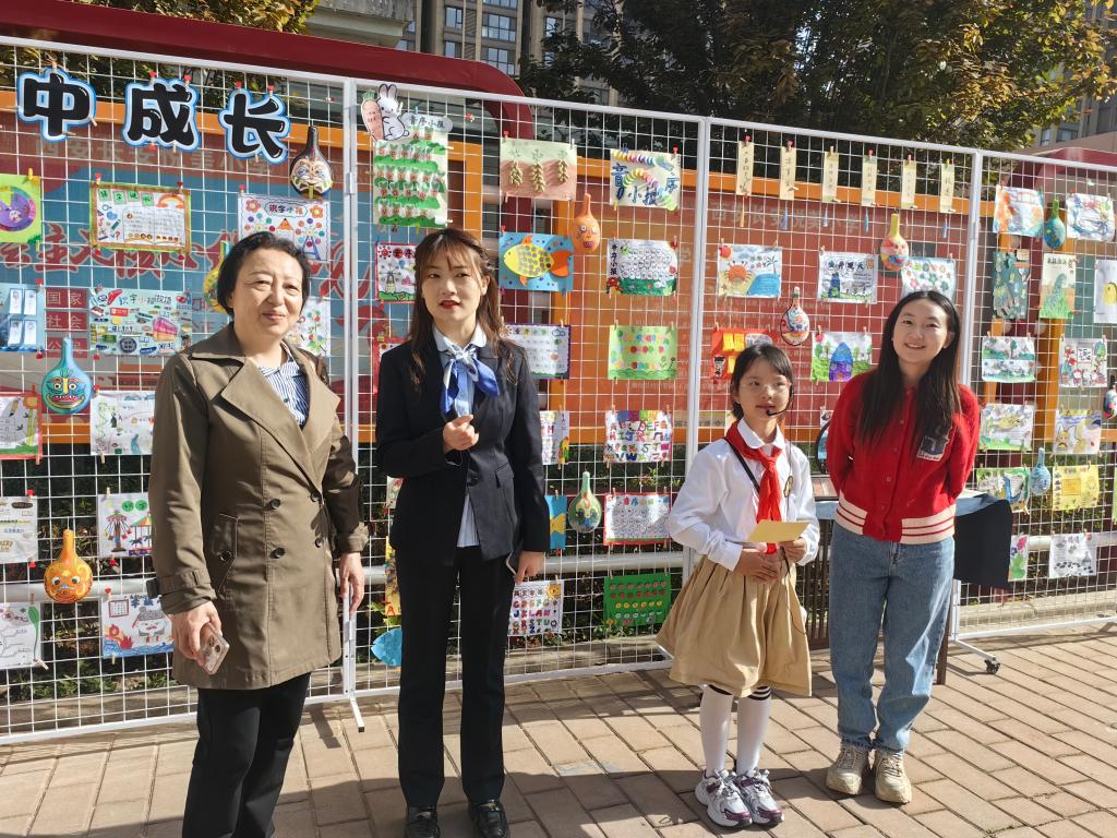 活动伊始,英语专业22级师生在悦美小学教导主任许晓晨的带领下,沉浸式体验了校园读书节节日展演。在书法展览区,行云流水的毛笔字、工整娟秀的硬笔书法作品,展现出悦美小学学生扎实的书写功底和对传统文化的热爱。绘画展览区更是精彩纷呈,孩子们以书为灵感源泉创作的一幅幅画作,色彩斑斓、精彩纷呈。每一幅作品都诠释着他们对书籍世界的独特理解,师生们驻足欣赏、赞叹不已、流连忘返。