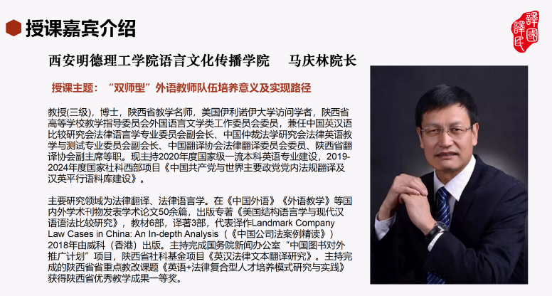 2月21日上午,受主办单位译国译民集团有限公司邀请,语言文化传播学院院长马庆林教授作为主讲嘉宾,为其举办的“双师型”教师队伍高质量建设研修班作了“强基固本 争创一流——beat365vip官网登录入口语言文化传播学院‘双师型’外语教师队伍培养及实现路径” 的线上主题发言。