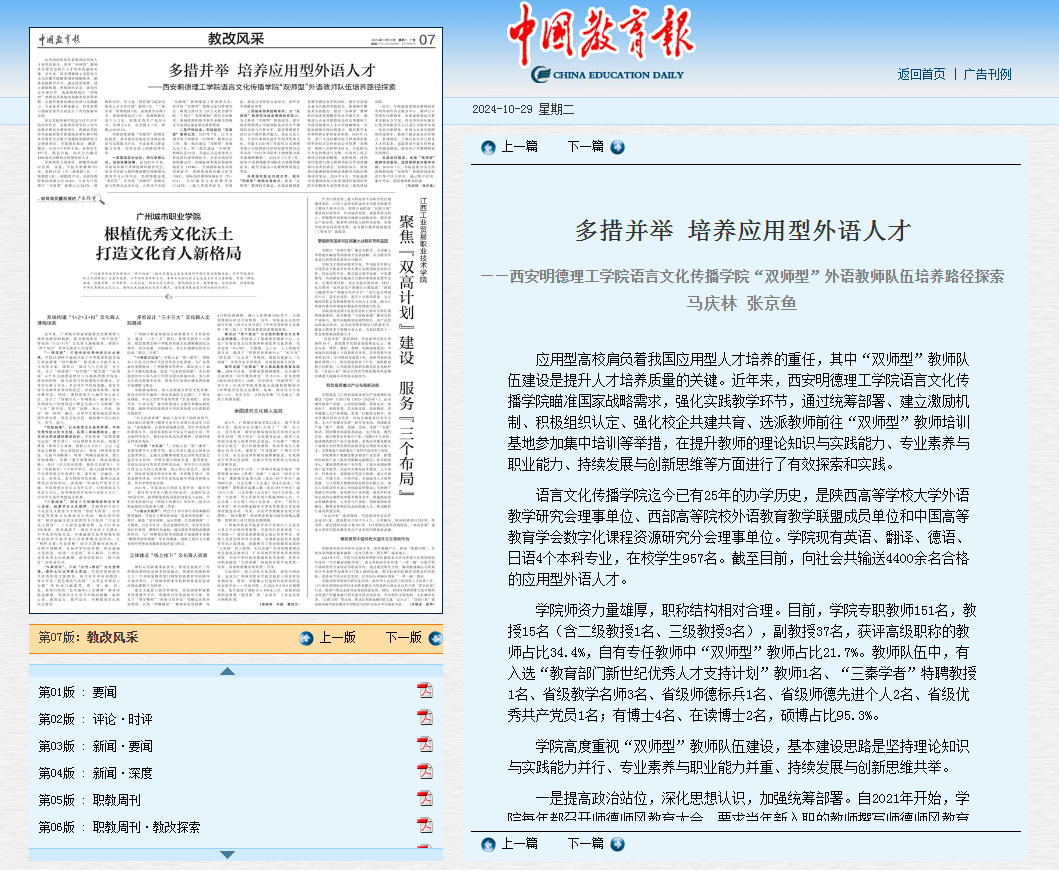 教育大计,教师为本。“双师型”教师队伍建设是提升人才培养质量的关键。瞄准国家战略需求,立足应用型办学定位,语言文化传播学院多措并举,培养造就新时代高水平教师队伍,积极推动“双师型”教师队伍建设,强化实践教学,提升应用型人才培养质量。10月29日,《中国教育报》对beat365语言文化传播学院“双师型”教师队伍建设的探索实践进行了报道,引起广泛关注。