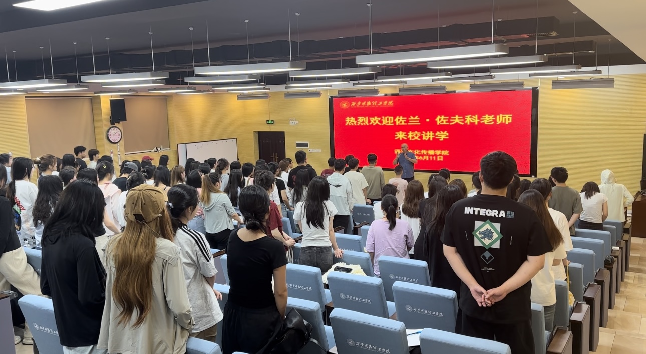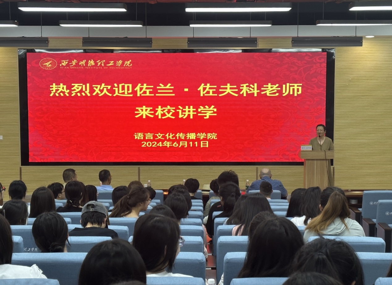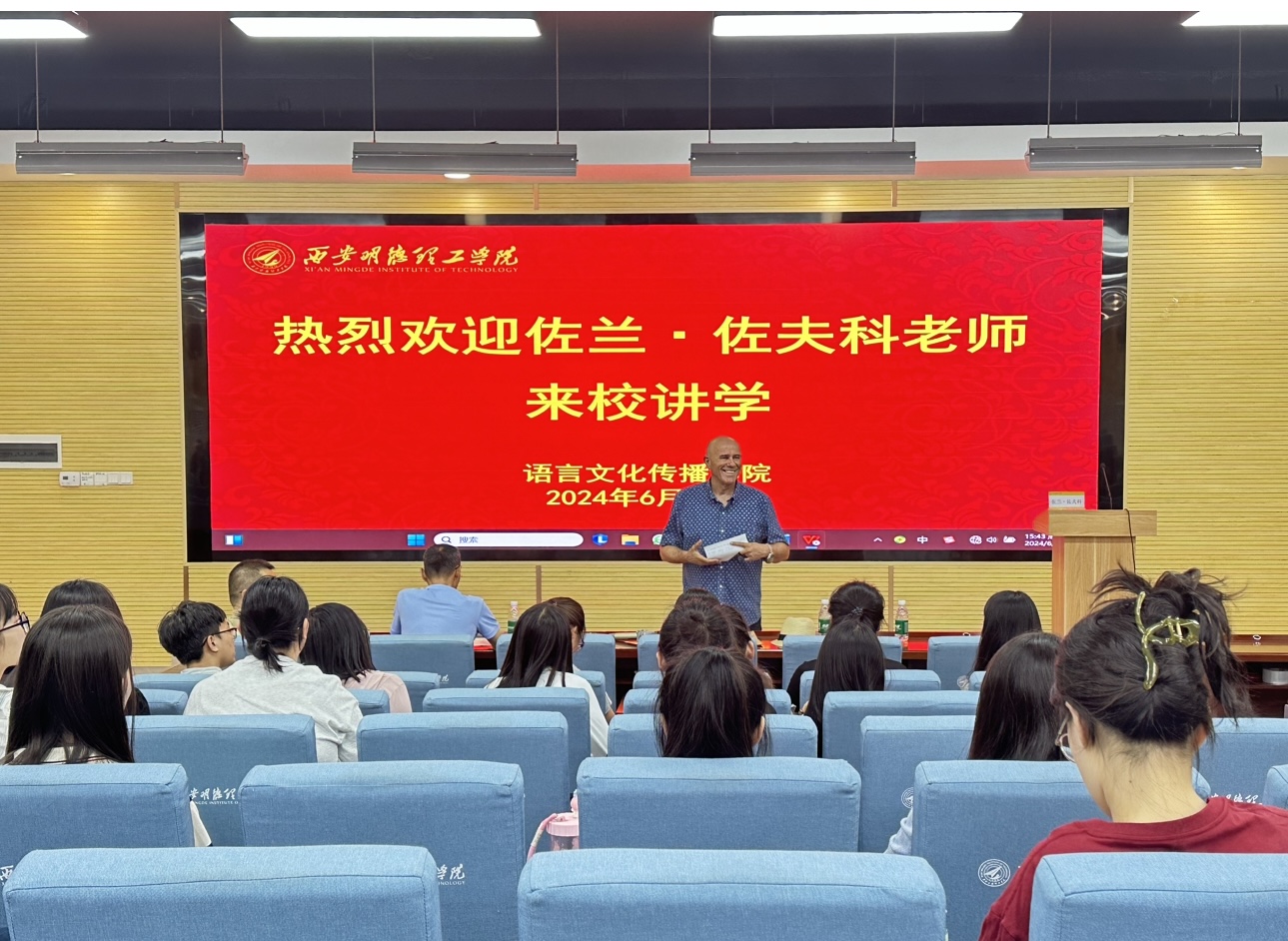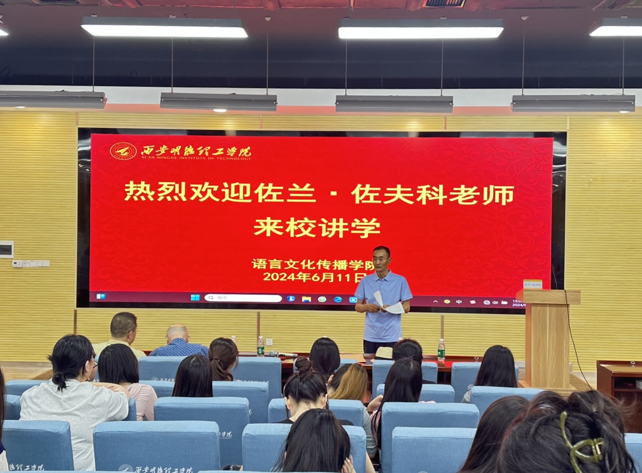 2024年6月11日下午,语言文化传播学院邀请校企合作单位西安人哲企业文化传播有限公司校长王春龙、外教佐兰·佐夫科、和随行翻译,在建德楼201报告厅给英语专业师生做了一场别开生面的讲座,讲座由英语专业负责人陈虹主持。