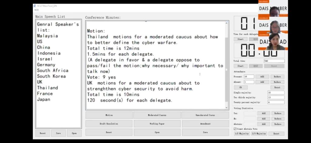因为此次疫情的原因,原定于线下的模拟联合国会议采取了线上会议的形式,从立场文件的撰写到决议草案的通过,不管是对于会议主席还是代表们都是一种与以往会议不同的体验。会议开始前,由此次会议主席黄沁、周卉、和Arya分别介绍了此次会议流程。