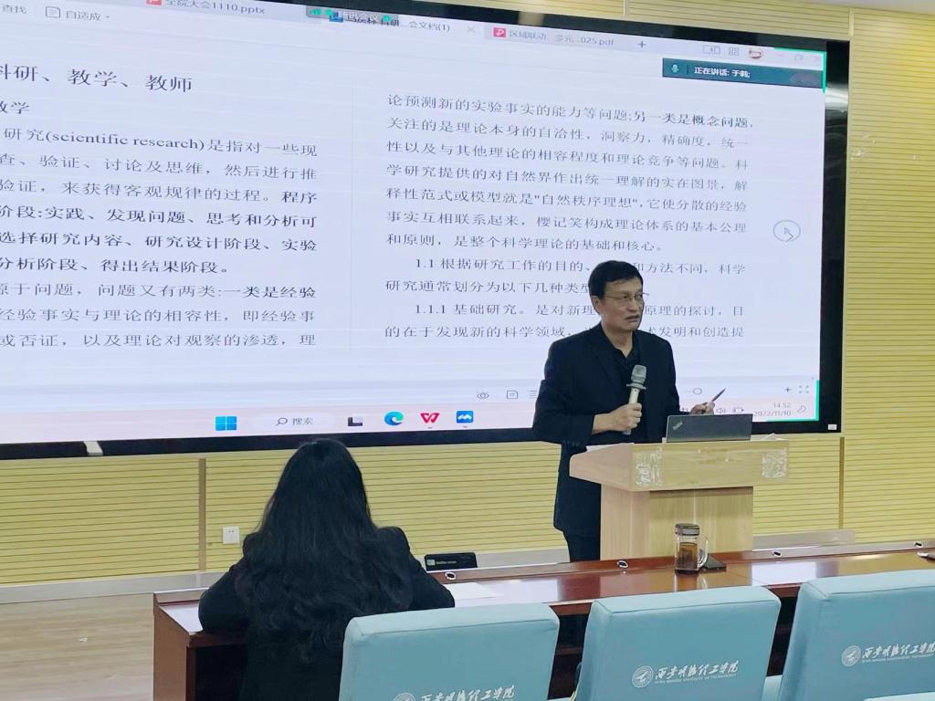 院长马庆林以《科研、教学、教师》为题作了总结报告,从教学与科研的内涵、教学与科研的关系、如何做科研、教师的理解等四个方面进行交流分享。由教学与科研的定义和基本内涵着手,由浅入深的阐述了两者辩证关系,指出科研是教学的“源头活水”,如果没有科研做支撑,大学课堂教学就会失去“灵魂”。同时还点明做科研一定要有明晰的研究志趣和方向、选择有意义的选题、以解决问题为导向,并阐述了高校教学改革研究课题的八个方向。马庆林强调,教师是学校的第一资本,是学校最丰富、最有潜力、最有生命力的教育资源,教师队伍建设是学校内涵发展的核心,教师的专业成长是学校可持续发展的根本保证,希望全院教师凝心聚力,锐意进取,共同推进我院教学科研工作,提升育人水平和教育教学质量。