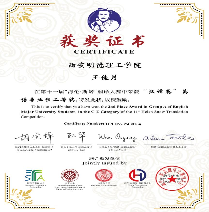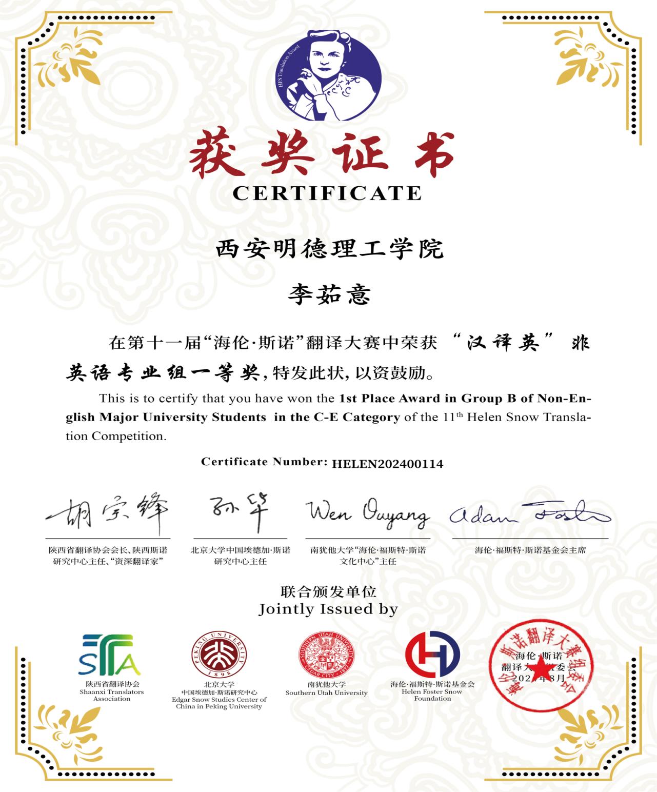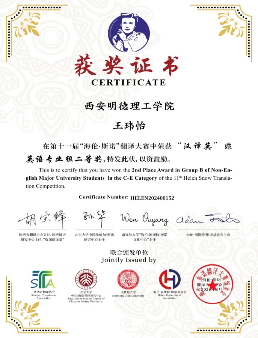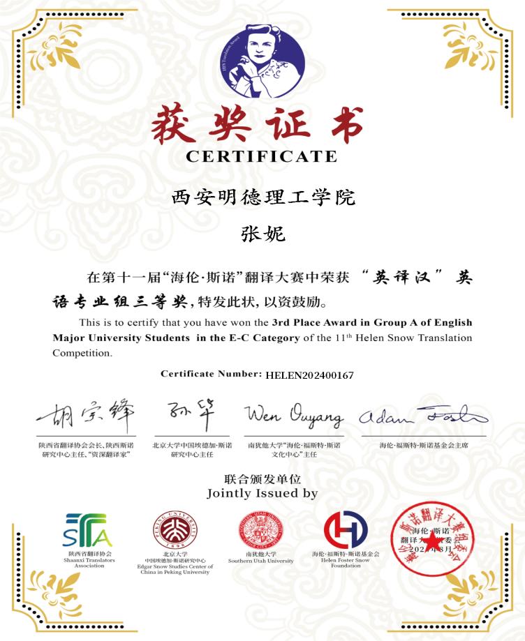 第十一届“海伦.斯诺”大赛部分获奖证书展示: