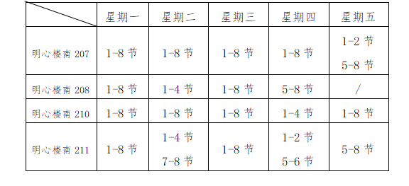 实验室开放时间为每周一至周五的8:00—17:30(节假日除外,并不得与正常教学活动冲突)。15-17周(6月12-28日)具体可使用时间如下表: