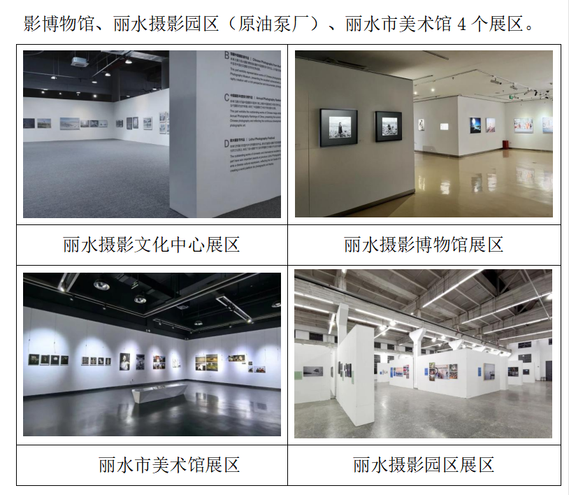 本届大会展览和相关活动主要集中在丽水摄影文化中心、丽水摄影博物馆、丽水摄影园区(原油泵厂)、丽水市美术馆4个展区。