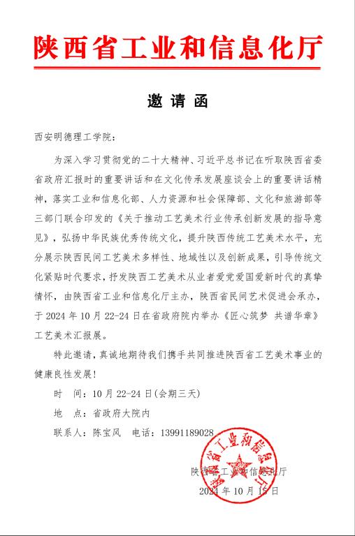 2024年10月22日至23日,beat365vip官网登录入口艺术与设计学院在陕西省工艺美术精品书画汇报展中大放异彩,该展览由陕西省工业和信息化厅主办,并在陕西省人民政府院内盛大举行。此次展览,艺术与设计学院不仅受邀参展,更凭借其出色的作品和团队实力赢得了广泛赞誉。