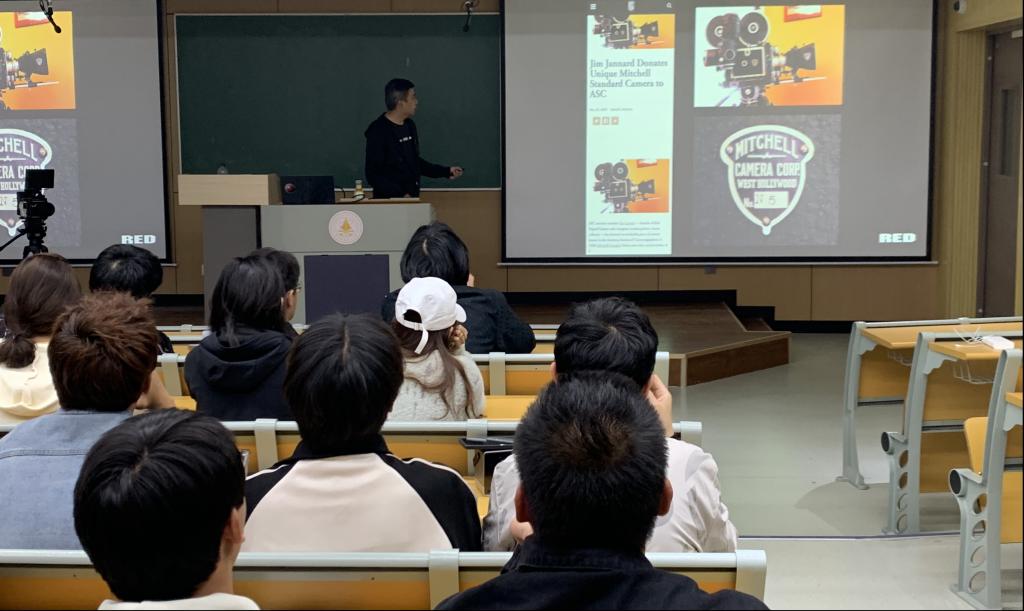 着重分享了如何通过电影摄影机获得更加细腻、真实且能够让观众更加沉浸于电影所营造的视觉世界中的摄影技巧,丰富、生动、形象的案例极大的拓宽了学生们的视野。他强调摄影技术在电影创作中的重要性,并鼓励学生们要敢于尝试、勇于创新,不断提升自己的专业素养和审美能力。
