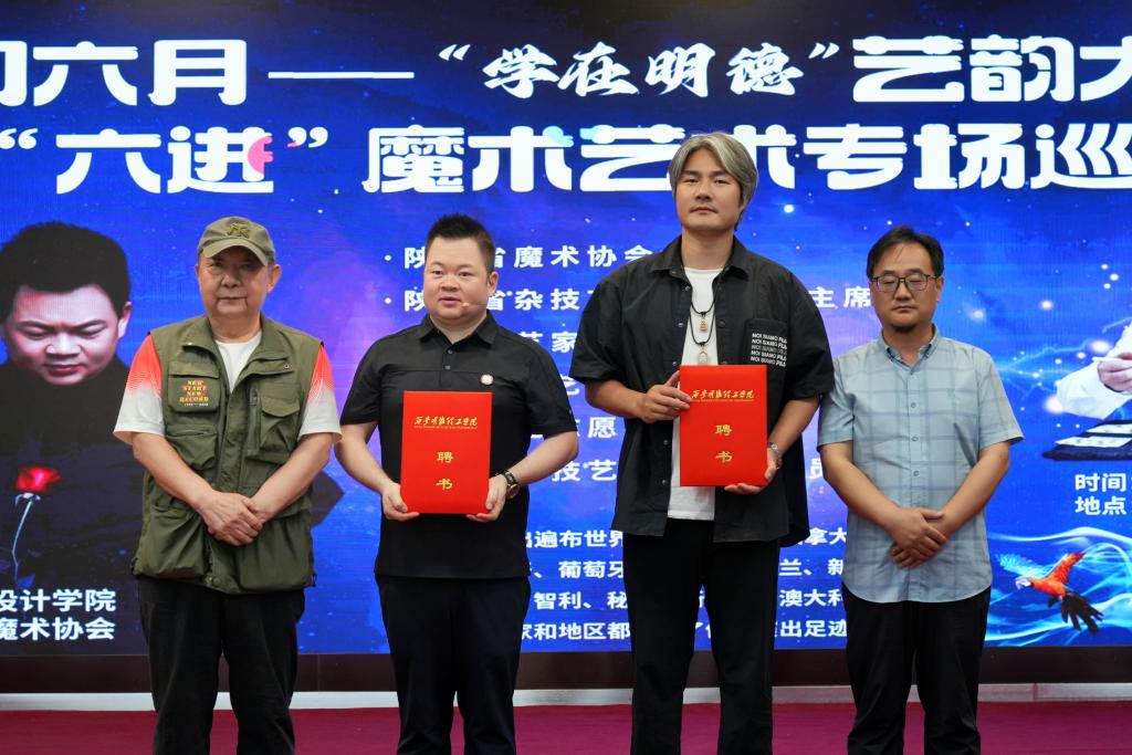 艺术与设计学院大师工作室特聘教授柏雨果、副院长冯强共同为欧阳会长和张杨副会长颁发文化艺术活动校外指导教师聘书。这不仅是一份荣誉,更意味着beat365vip官网登录入口艺术与设计学院将携手陕西省魔术协会,在艺术教育领域展开深度合作。未来,魔术课程、创意工坊等特色活动有望走进校园,为学生们搭建更多元的艺术实践平台。