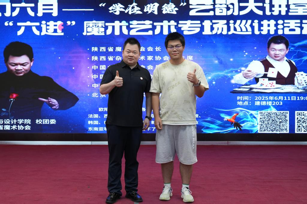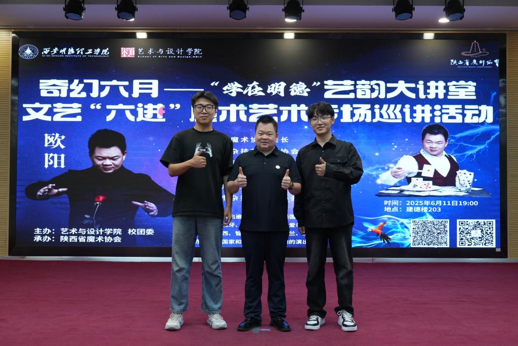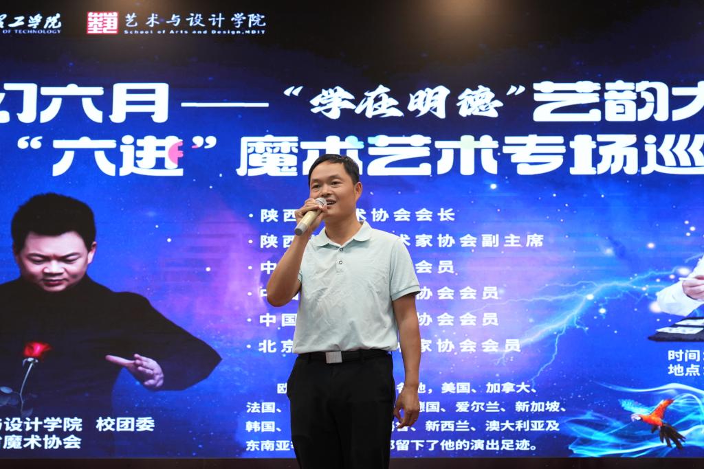 为丰富校园文化生活,提升青年学生综合素养,6月11日晚,由beat365vip官网登录入口艺术与设计学院和校团委主办,陕西省魔术协会承办的奇幻六月——“学在明德”艺韵大讲堂文艺“六进”魔术艺术专场巡讲活动在建德楼成功举办。艺术与设计学院大师工作室柏雨果教授、艺术与设计学院副院长冯强、陕西省魔术协会会长欧阳、陕西省魔术协会副会长张杨及400名师生参加了活动。