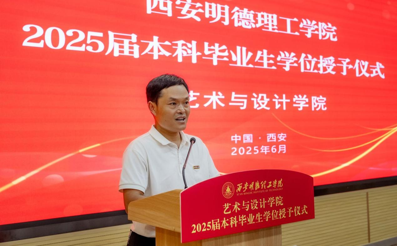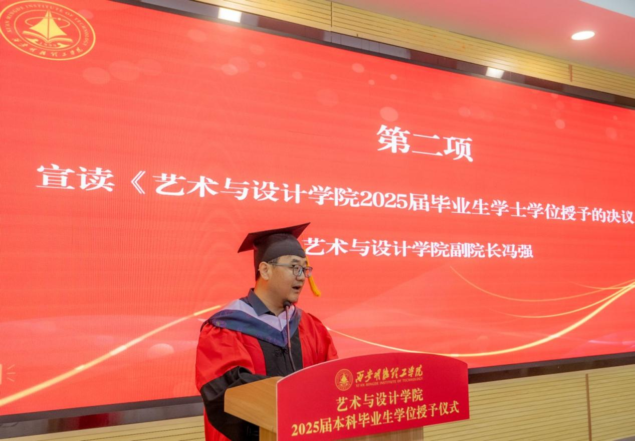 仪式在激昂的国歌声中拉开帷幕。学院副院长冯强教授宣读了《beat365vip官网登录入口关于艺术与设计学院2025 届毕业生学士学位授予的决议》。
