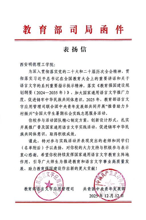 “心相通·语先行”实践队精心制定方案、创新设计形式,扎实开展推广普及国家通用语言文字实践活动,促进铸牢中华民族共同体意识,为推进教育和语言文字事业高质量发展、助力教育强国建设作出新贡献。下一步,学院将以此次荣誉为契机,深化校地合作,持续探索乡村振兴新路径,引导更多师生以青春之力深耕语言振兴热土,让普通话成为乡村发展的“金钥匙”。