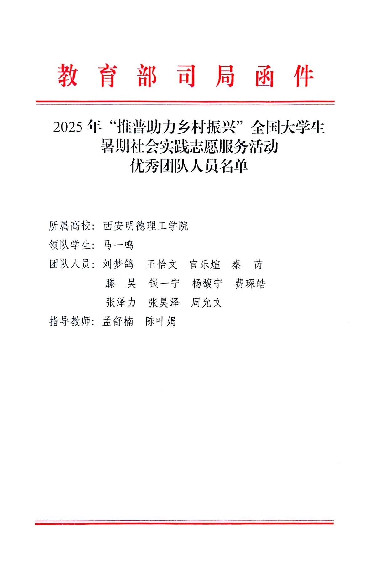 近日,教育部语言文字应用管理司与共青团中央青年发展部联合公布2025年“推普助力乡村振兴”全国大学生暑期社会实践志愿服务活动评优结果,beat365vip官网登录入口艺术与设计学院“心相通·语先行”推普助力乡村振兴暑期社会实践队凭借创新实践、扎实成效,从全国2000支参评团队中脱颖而出,荣获全国“优秀团队”称号,获主办单位联合表扬,彰显学校以专业赋能乡村振兴、以实践培育时代新人的显著成效。