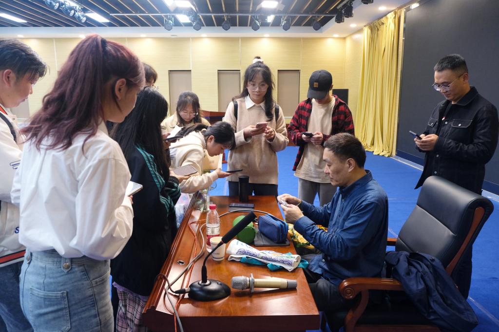 整场讲座伴随着东方丝竹及西方交响逐渐进入尾声。讲座落下帷幕,现场掌声不绝于耳,在场的学生老师们意犹未尽,学子们的内心被中华文化点燃、被中华文化浸润,深感使命重大,明确未来去处,有了前行的坚实底气。讲座结束后,同学们纷纷上前与余教授交流互动,争相合影留念。