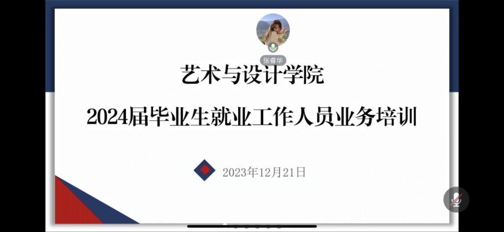 为优化就业措施,创新就业方法,助推2024届毕业生就业工作,艺术与设计学院近期召开2024届毕业生就业动员部署及政策解读会。会议采取线上线下结合的方式进行,招生就业中心办公室主任王育春应邀进行线下就业政策就读,毕业生辅导员张睿华线上进行就业指导业务培训。艺术与设计学院全院教职工参加会议,会议由学院党委书记雷宇主持。