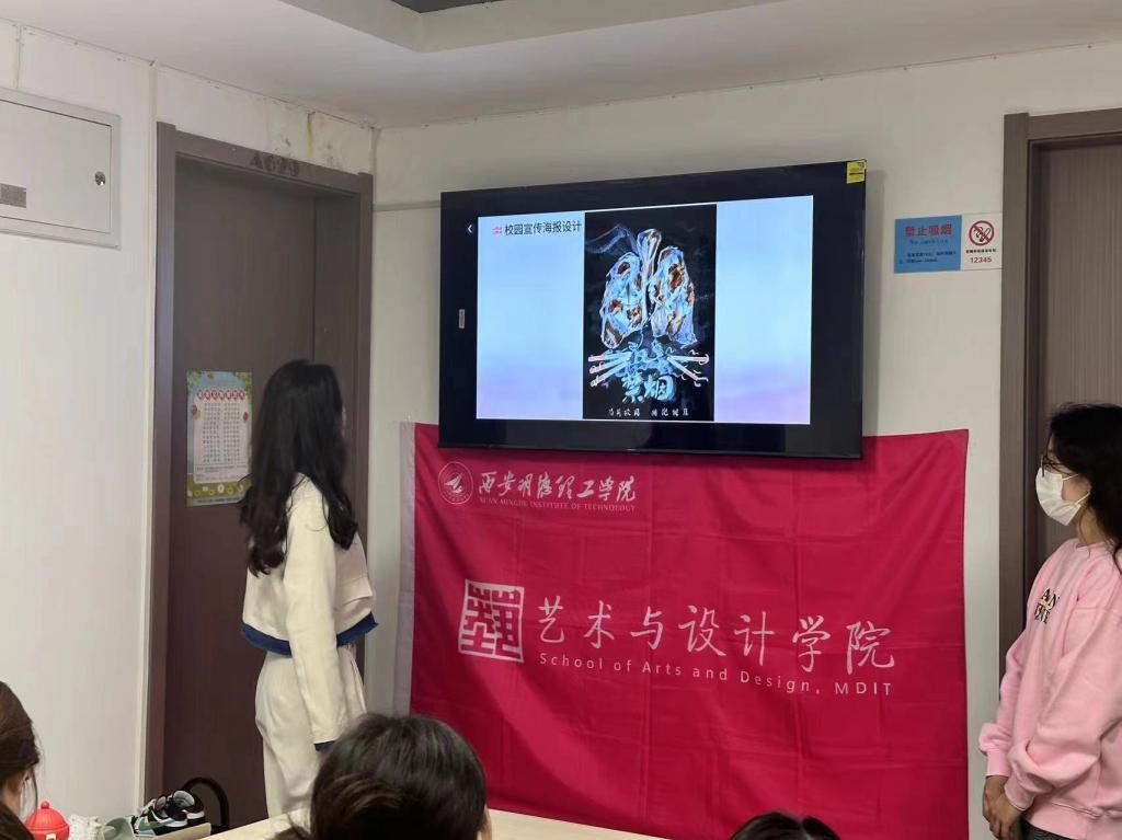 会上,组织大家观看了艺术与设计学院拍摄的相关禁烟活动的微电影宣传片和海报设计。