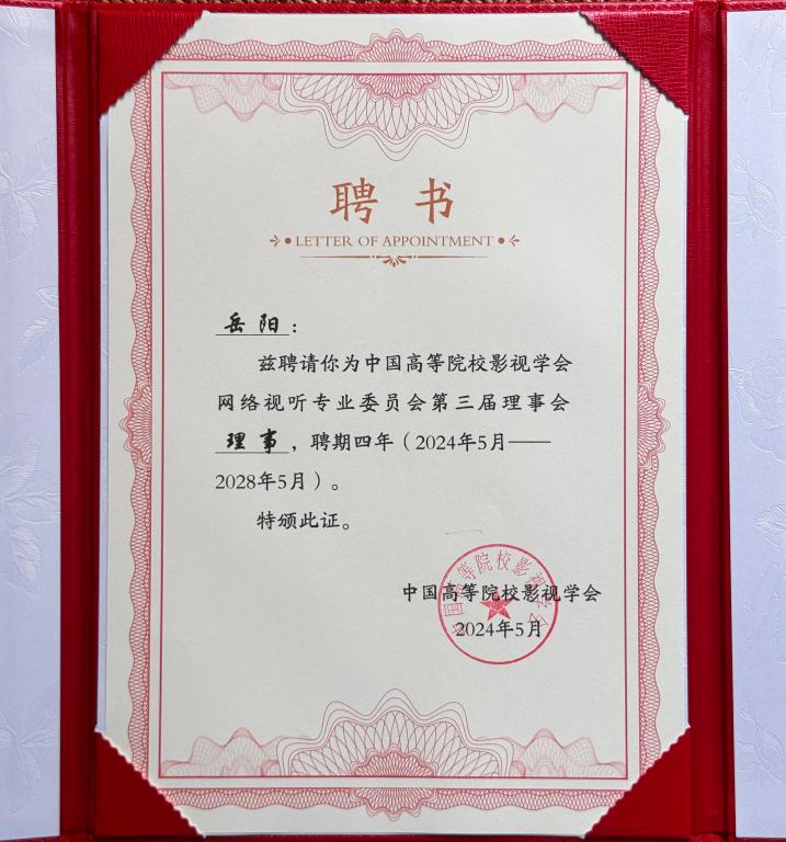 2024年5月18日至19日,中国高校影视学会网络视听专业委员会第三届理事会成立大会暨第六届中国高校网络视听论坛在重庆对外经贸学院隆重举行。我院数媒教师岳阳当选中国高校影视学会网络视听专委会理事。