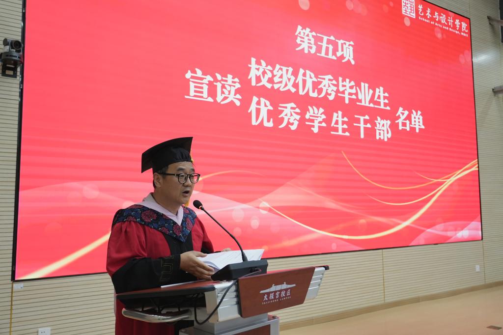 教师代表舒粉利老师祝贺各位毕业学子毕业快乐,即将迈入新的人生阶段,同时也代表艺术与设计学院全体教师感谢毕业生们的一路相伴。希望同学们永葆好奇心和求知欲,勇敢地去尝试、去探索、去验证,在探索与实践中成长。希望大家在毕业后能继续保持对艺术的热爱,一直践行“明德、亲民、至善”的校训,在未来人生路上能坚毅面对人生逆境和挑战,用更加昂扬的斗志去迎击。