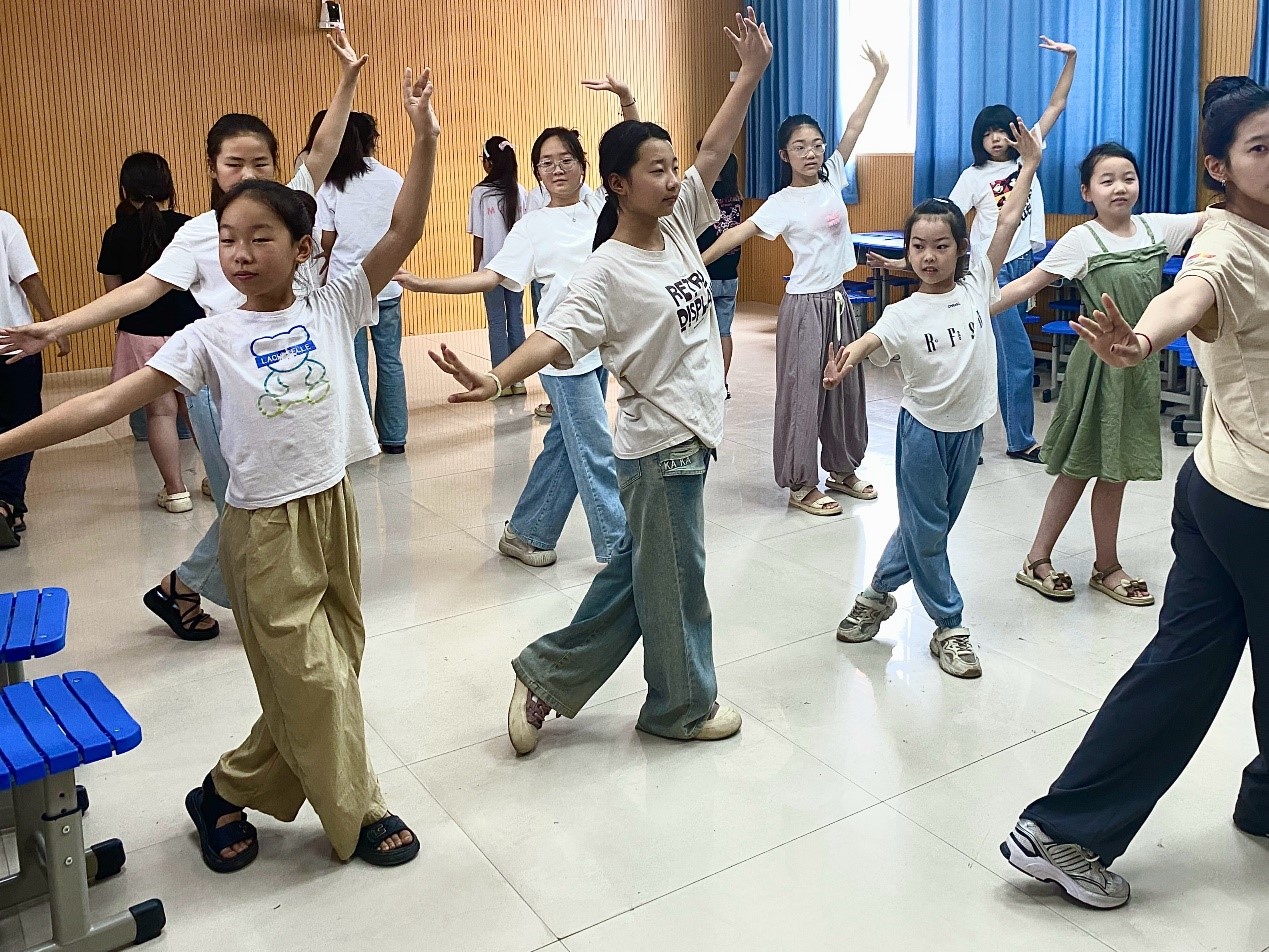 水袖舞作为中国传统文化的瑰宝,以其独特的韵味和柔美的动作吸引了孩子们的注意。“小”老师们耐心地讲解每一个动作的要领,从基本的手位到步伐的移动,再到水袖的翻飞,每一个细节都力求完美,孩子们在手把手的指导下,逐渐掌握了水袖舞的基本技巧,通过精心设计的队形和走位,配以音乐的练习,帮助孩子们呈现了一场灵动水袖表演。
