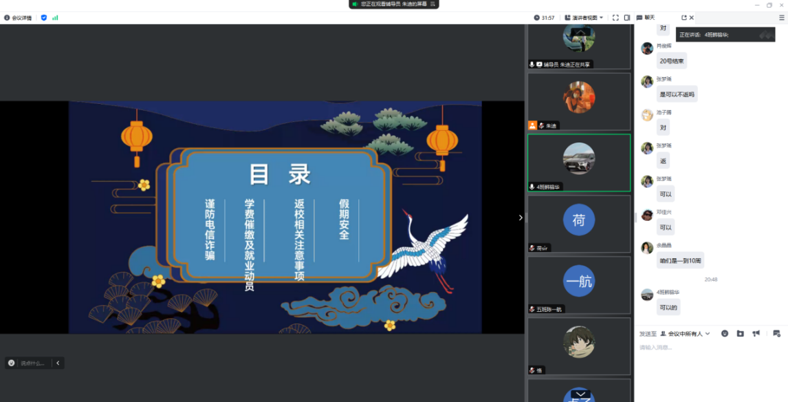 此外,班会还特别强调了返校后的宿舍安全和校园安全。辅导员提醒学生们要遵守宿舍管理规定,注意用电安全,禁止使用违章电器,保持宿舍的清洁和通风。同时,在校园活动中要遵守纪律,不参与危险或违规的活动,确保自己和他人的安全。