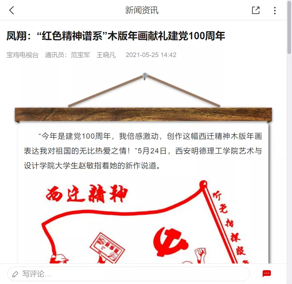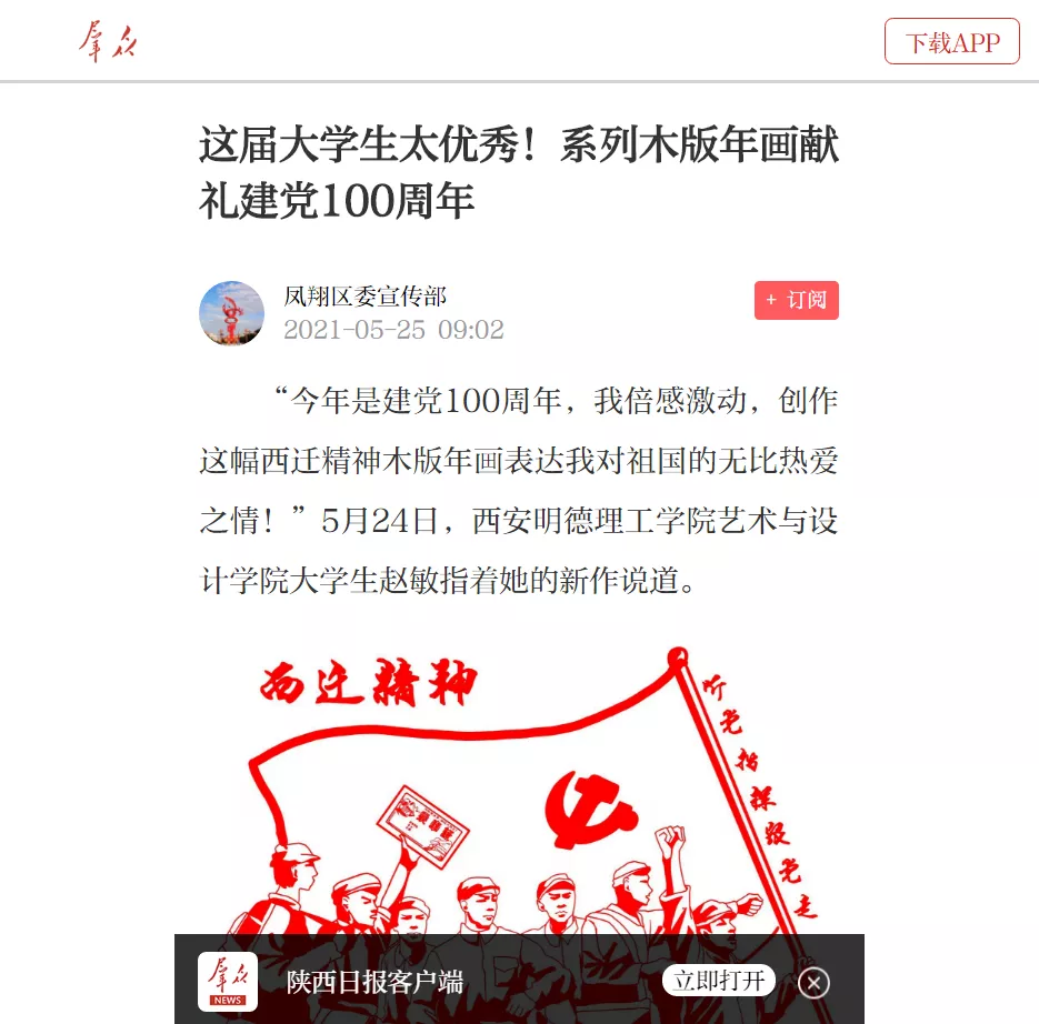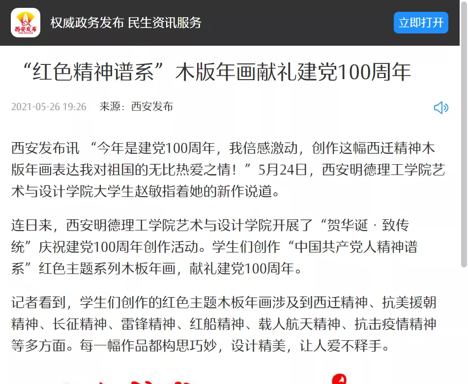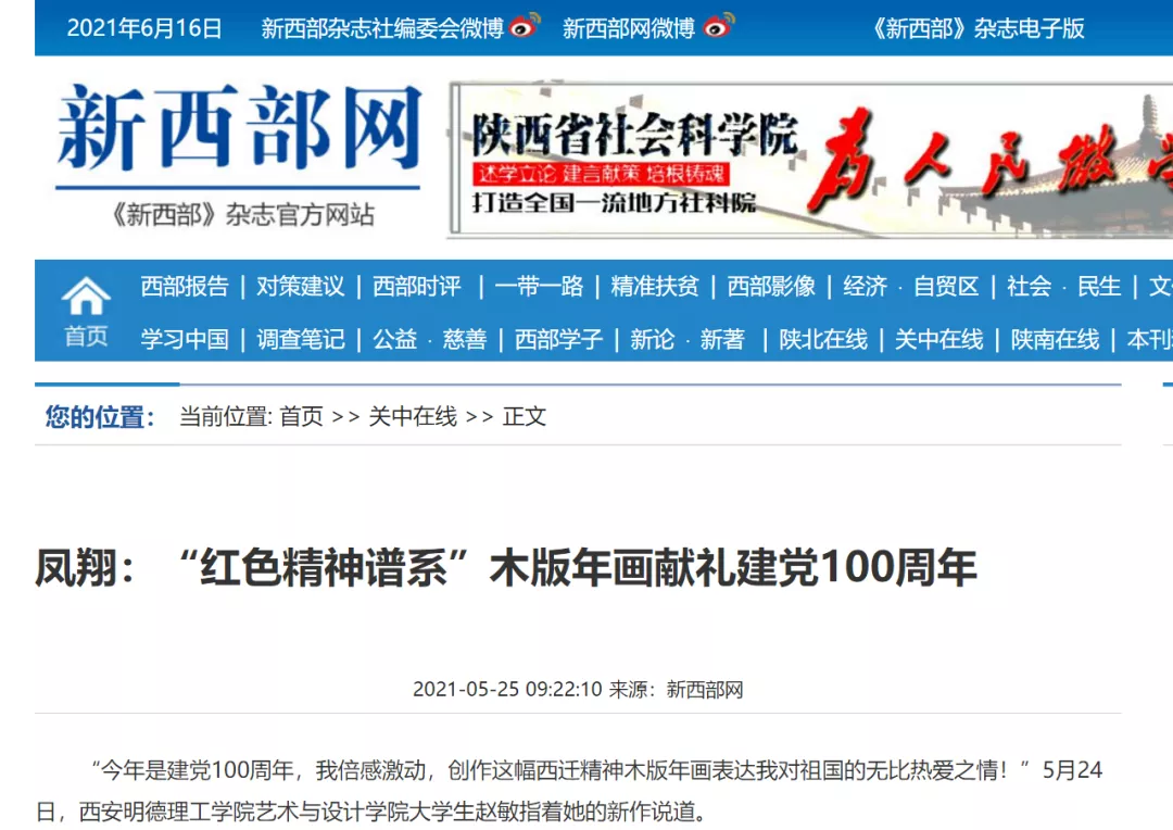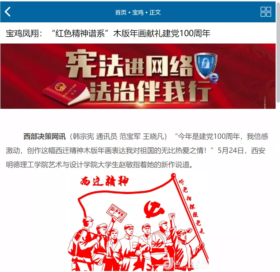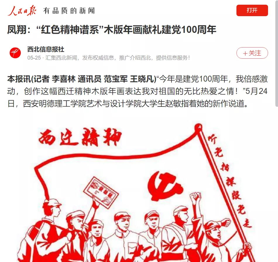 为庆祝中国共产党百年华诞,beat365师生以凤翔木版年画的风格,设计纂刻出了20余个精神谱系,以这种形式集中展示中国共产党百年历程中形成的伟大精神,取得的伟大成就,让师生在实践中感受中国共产党的精神伟力。beat365师生创作的“红色精神谱系”木版年画受到了人民日报客户端、陕西日报客户端、西安发布、阳光网、网易新闻、宝鸡电视台、宝鸡日报、《新西部》杂志等媒体的广泛报道。
