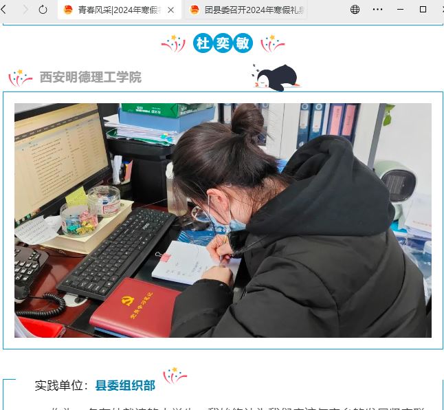 这个寒假,105022103班杜奕敏同学回到家乡,用社会实践为家乡发展添砖加瓦,留下属于自己最珍贵的青春纪念!作为一名党员,她深知要不断的在社会实践中完善自己,积极报名参加了“返家乡”社会实践活动,经过严格的面试筛选,被分配到了礼泉县委组织部进行政务实习,切身感受党的领导下过去五年和新时代十年取得宏伟成就,在服务家乡、服务人民中学、思、践、悟了习近平新时代中国特色社会主义思想和党的二十大精神,用实际行动贡献青春力量。